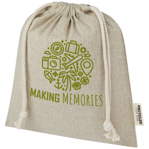Torba upominkowa wykonana z bawełny z recyklingu z certyfikatem GRS z zamknięciem na sznurek bawełniany. Idealna do prezentów lub przechowywania przedmiotów. Wymiary: 25 x 30 cm.