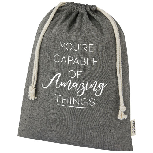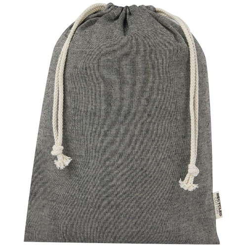 Torba upominkowa wykonana z bawełny z recyklingu z certyfikatem GRS z zamknięciem na sznurek bawełniany. Idealna do prezentów lub przechowywania przedmiotów. Wymiary: 30 x 42 cm.