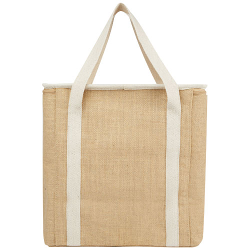 Duża torba termoizolacyjna Juta wykonana z wytrzymałej i odpornej na zużycie laminowanej juty. Posiada dużą (19 litrową) komorę główną, która może pomieścić sześć 1,5-litrowych butelek, wyłożoną wyjątkowo grubą i bezpieczną dla żywności izolacją aluminiową, która utrzymuje napoje, artykuły spożywcze i przekąski w niskiej temperaturze, suche i chronione przez wiele godzin. Torba ma górne zapięcie na suwak, przednią kieszeń i 2 bawełniane tkane uchwyty (50 x 2,5 cm). Wyprodukowano w Indiach z certyfikatem OEKO-TEX®.