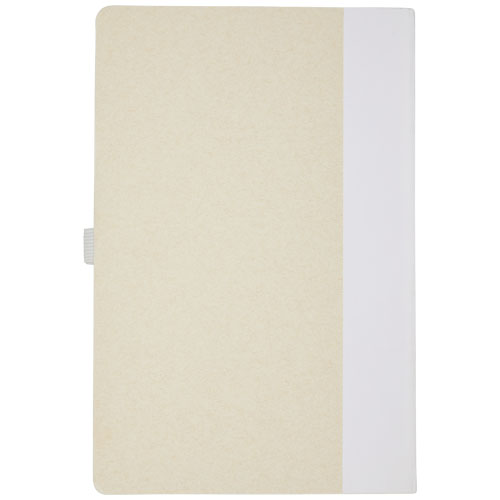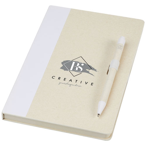 Zestaw z notatnikiem w formacie A5 i długopisem. Notatnik zawiera 80 kartek w linie (80 g/m²) wykonanych z poddanych recyklingowi kartonów po mleku (do 70%), grzbiet z kolorowego papieru i pętelkę na długopis. W pętelce na długopis znajduje się długopis na przycisk w dopasowanym do notatnika kolorze. Długopis ma korpus wykonany z tego samego materiału z kartonów mleka poddanych recyklingowi, a przycisk, klips i końcówka są wykonane z kolorowego tworzywa sztucznego PLA. W środku długopisu znajduje się czarny wkład. Zużyte kartony po mleku są zbierane, sortowane, przetwarzane i zamieniane w papier, co pozwala na przekształcenie odpadów w coś użytecznego.
