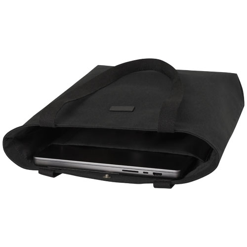 Torba na zakupy wykonana z płótna z recyklingu z certyfikatem GRS, z podszewką z RPET z certyfikatem GRS. Ta uniwersalna torba na zakupy posiada wyściełaną przegrodę na 15-calowego laptopa i dwie kieszenie wewnętrzne na telefon, portfel lub akcesoria, a także łatwe zapięcie na guzik i wygodne bawełniane uchwyty. Ozdobna metalowa płytka może sprawić, że logo będzie świecić dzięki subtelnemu i matowemu wykończeniu.
