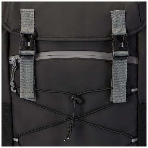 Wodoodporny plecak na laptopa wykonany z materiałów z recyklingu posiadających certyfikat GRS, w tym zamków błyskawicznych. Posiada przestronną przegrodę na laptopa o ekranie 15,6" ze sznurkiem ściągającym i regulowanymi klamrami, aby zmaksymalizować przestrzeń do przechowywania pod klapą. Ten plecak ma wiele kieszeni, w tym zapinaną na zamek przednią kieszeń z elastycznymi sznurkami do przechowywania i organizowania oraz odblaskowe lamówki zapewniające widoczność. Wyprofilowany i wyściełany spód oraz regulowany pasek na klatkę piersiową sprawiają, że jest wygodny do noszenia nawet, gdy jest w pełni załadowany. Materiały z recyklingu GRS obejmują główny materiał, podszewkę, taśmy i zamki błyskawiczne. Pojemność: 23 litrów. Wolne od PVC.