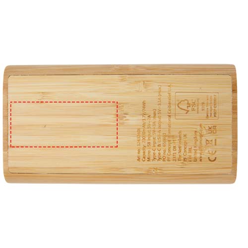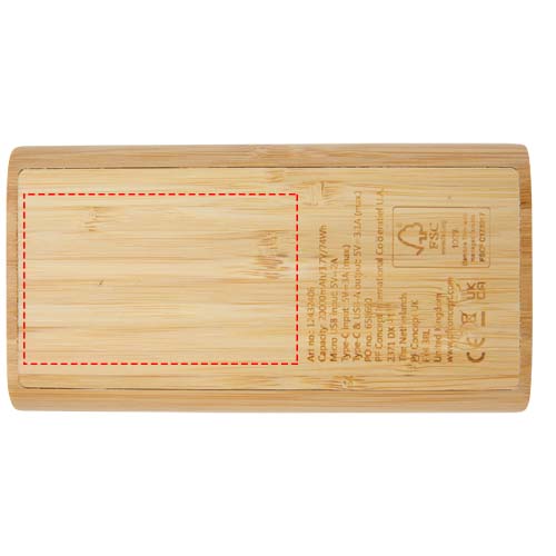 Powerbank o pojemności 20 000 mAh wykonany z bambusa, wyposażony w przycisk dotykowy WŁ./WYŁ. i 4 wskaźniki LED pokazujące pozostałą pojemność baterii. Wejście Micro USB 5 V/2 A, wejście typu C 5 V/3 A, wyjście typu C maks. 5 V/3,1 A, podwójne wyjście USB-A maks. 5 V/3,1 A, całkowita moc 15,5 W. Dostarczany z 30-centymetrowym kablem ładującym TPE 3A typu C do typu C, instrukcją obsługi i pudełkiem upominkowym z papieru Kraft. Ponieważ bambus jest produktem naturalnym, mogą występować niewielkie różnice w kolorze i rozmiarze, które mogą mieć wpływ na ostateczny wygląd nadruku.