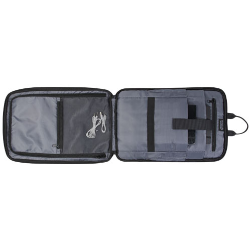 Plecak Rise wykonany z trwałego poliestru 900D z recyklingu z certyfikatem GRS spełnia wszystkie niezbędne funkcje. Posiada wyściełane etui na laptopa o przekątnej 15,6 cali, dodatkową kieszeń na mały notebook lub tablet oraz zapinane na zamek kieszenie na mniejsze przedmioty. Dodatkowo po wewnętrznej stronie znajduje się elastyczny pasek do mocowania butelek z wodą. Z tyłu plecaka znajduje się wygodny, elastyczny pasek, który ułatwia przymocowanie go do wózka.