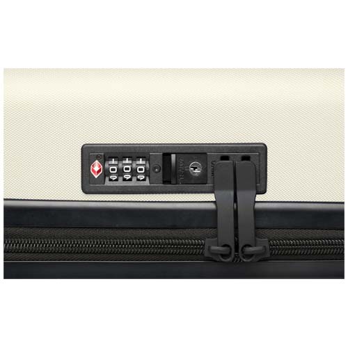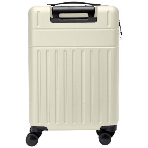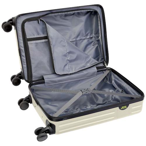 Twarda walizka na kółkach Rover o wysokości 51 cm, wyprodukowana z odpornych na uderzenia tworzyw sztucznych pochodzących z recyklingu i wyściółki RPET to produkt zarówno wysokiej jakości, jak i przyjazny dla środowiska. Posiada aluminiową ramę z podwójnymi rurkami, 4-kołowy mechanizm obrotowy 360 stopni, zintegrowany zamek szyfrowy TSA, wygodny uchwyt zapewniający komfort i wewnętrzne przegródki organizacyjne. Może być przewożona jako bagaż podręczny w większości głównych linii lotniczych. Walizka posiada certyfikat GRS, łącznie z nadrukiem, co sprawia, że jest wyborem bardziej przyjaznym dla środowiska.
