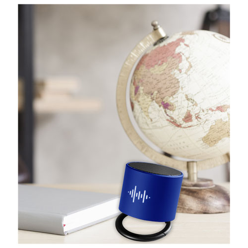 Bezprzewodowy głośnik Bluetooth® o mocy 3W z podświetlanym logo oraz podwójnym wyjściem dźwięku dla niezrównanej jakości brzmienia jak na głośnik tego rozmiaru. Głośnik można odchylić, aby skierować dźwięk w dowolnym kierunku. Posiada wbudowany mikrofon i funkcję połączeń konferencyjnych. Pojemność: Bateria o pojemności 500 mAh - 3,7 V. Częstotliwość: 50 Hz - 20 KHz. Moc dźwięku: 1 x 3 W. Impedancja: 4 Ω. Bluetooth® 4.2. Waga netto: 100 gramów. Wymiary: ∅ 50 mm x 45 mm. W zestawie znajduje się pudełko upominkowe z magnetycznym zamknięciem wykonane z papieru z recyklingu.