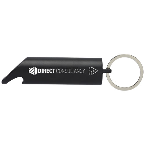 Jasna latarka LED z otwieraczem do butelek, przyciskiem włączania/wyłączania i żelaznym kółkiem na klucze. Wykonana z lekkiego i wytrzymałego aluminium z certyfikatem RCS pochodzącego w 63% z recyklingu. Recycled Claim Standard (RCS) weryfikuje zawartość surowców wtórnych w produkcie w całym łańcuchu dostaw. Dostępny w różnych efektownych kolorach z metalicznym wykończeniem, ładnie podkreślających drukowane logo. Dostarczane z trzema bateriami LR44 w zestawie.
