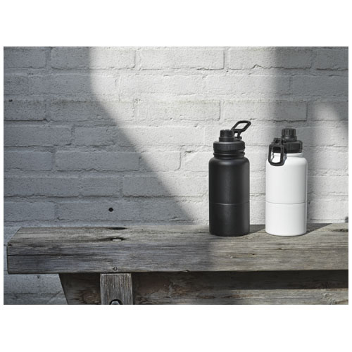 Wielofunkcyjna, izolowana butelka ze stali nierdzewnej z certyfikatem RCS i wyjmowanym pojemnikiem do przechowywania. W górnej części butelki znajduje się miedziany, izolowany termos o pojemności 530 ml, który utrzymuje niską lub wysoką temperaturę napoju przez kilka godzin. Dolna część to dwuścienny pojemnik o pojemności aż 340 ml. Może być używany jako kubek na ulubione zimne napoje lub do przechowywania przekąsek albo innych drobnych przedmiotów. Zapakowana w pudełko upominkowe wykonane z kartonu z recyklingu.