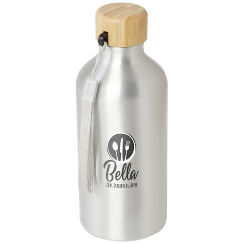 Butelka na wodę z aluminium pochodzącego z recyklingu z certyfikatem RCS, ze stylową bambusową pokrywką. Ta lekka, jednościenna butelka jest wyposażona w pasek ułatwiający przenoszenie. Bambus pochodzi ze zrównoważonych, ekologicznie i społecznie odpowiedzialnych źródeł. Pojemność 500 ml. Tylko do mycia ręcznego.