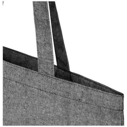 Torba na zakupy wykonana z mieszanki bawełny i poliestru pochodzących z recyklingu o gramaturze 150 g/m². Torbę można łatwo złożyć, aby zmieściła się w niewielkiej przestrzeni i jest idealnym towarzyszem podczas różnych czynności, takich jak zakupy spożywcze, jednodniowe wycieczki lub projekty rzemieślnicze. Bawełna poddana recyklingowi pochodzi z tzw. wstępnych odpadów konsumpcyjnych wytwarzanych przez zakłady włókiennicze w trakcie procesu cięcia. Podobne kolory są mieszane ze sobą, więc nie jest wymagane dodatkowe barwienie. Ze względu na charakter bawełny pochodzącej z recyklingu mogą występować niewielkie różnice w kolorze. Dodaje to bardziej autentycznego wyglądu. Do każdej torby dołączony jest również znacznik Aware™. Ta innowacyjna funkcja pozwala użytkownikom prześledzić za pomocą kodu QR pochodzenie produktu i pokonaną przez niego drogę, zwiększając przejrzystość łańcucha dostaw i wspierając silniejszy związek między produktem a jego procesem produkcyjnym. Wytrzymałość do 5 kg. Długość uchwytu: 31 cm.
