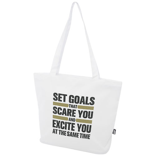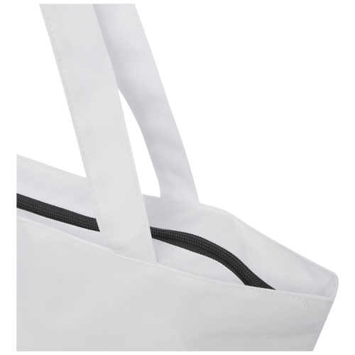 Panama zapinana na zamek błyskawiczny torba z wodoodpornego materiału RPET 600D z recyklingu z certyfikatem GRS to trwała, wielofunkcyjna torba na zakupy, która idealnie nadaje się na imprezę, plażę lub zakupy spożywcze. Posiada główną komorę zapinaną na zamek błyskawiczny oraz wewnętrzną kieszeń zapinaną na zamek błyskawiczny, która jest wystarczająco duża, aby pomieścić telefon i inne cenne rzeczy. Uchwyty mają długość 34 cm, dzięki czemu torbę można łatwo nosić na ramieniu. Wytrzymałość do 10 kg. Wolne od PVC.