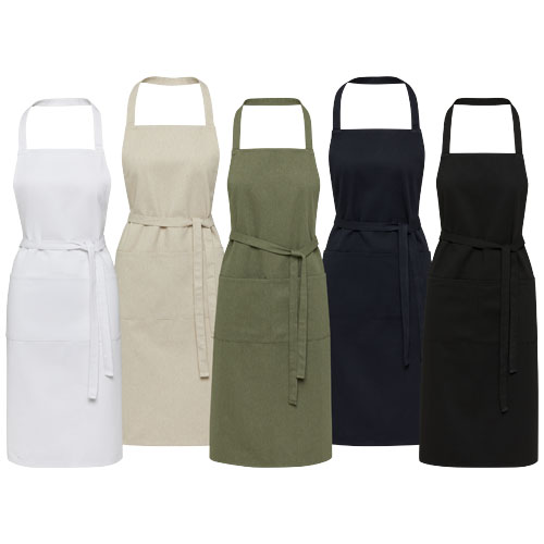 Shara fartuch o gramaturze 240 g/m2 wykonany w 70% z bawełny pochodzącej z recyklingu i w 30% z poliestru pochodzącego z recyklingu, dzięki czemu jest gruby, wytrzymały i wygodny w noszeniu. Posiada 2 przylegające do siebie kieszenie (każda o wymiarach 22 x 20 cm) i wiązanie z tyłu o długości 1 metra. Fartuch zawiera włókna Cyclo® pochodzące z recyklingu, w przypadku których wykorzystano wstępnie posortowane odpady, które mają wpływ na kolor przędzy. Włókna te nie tylko zmniejszają zapotrzebowanie na surowce pierwotne, ale także są przejawem zaangażowania w tworzenie obiegu zamkniętego, stanowiąc realny przykład zmniejszania ilości odpadów i promując gospodarkę w obiegu zamkniętym. Do każdego fartucha dołączony jest również znacznik Aware™. Ta innowacyjna funkcja pozwala użytkownikom prześledzić za pomocą kodu QR pochodzenie produktu i pokonaną przez niego drogę, zwiększając przejrzystość łańcucha dostaw i wspierając silniejszy związek między produktem a jego procesem produkcyjnym.