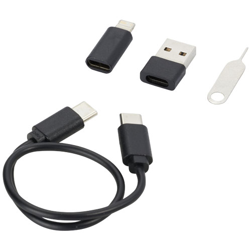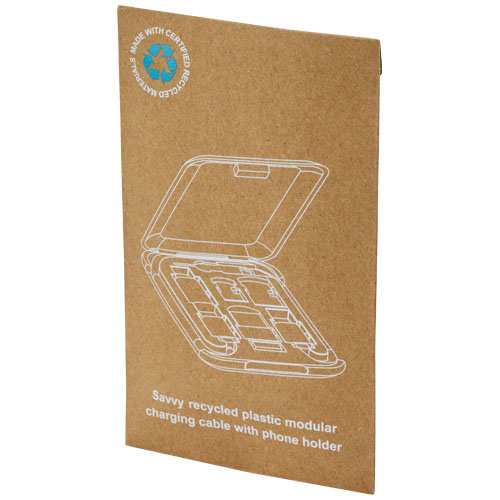 Modułowy kabel do transmisji danych i ładowania wykonany z tworzyw sztucznych pochodzących z recyklingu, dostarczany w eleganckim pudełku do przechowywania, które służy również jako stojak na telefon. Kabel oferuje wiele rozwiązań w zakresie ładowania: Wejście typu C i USB-A oraz wyjście typu C/iOS/micro USB. Dzięki tym wszystkim adapterom i złączom kabel ten umożliwia ładowanie większości smartfonów, aparatów fotograficznych, powerbanków, słuchawek dousznych itp. Kabel ma maksymalną moc wyjściową 2 A. Posiada wysuwaną szpilkę, która przydaje się zawsze, gdy trzeba wyjąć kartę SIM z telefonu. Pudełko do przechowywania ma również miejsce na kartę pamięci micro SD, a także kartę nano SIM, dzięki czemu jest to idealne akcesorium podróżne. Długość kabla: 26 cm. Dostarczany w kopercie z papieru Kraft pochodzącego w 100% z recyklingu.