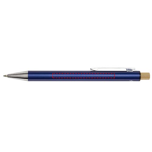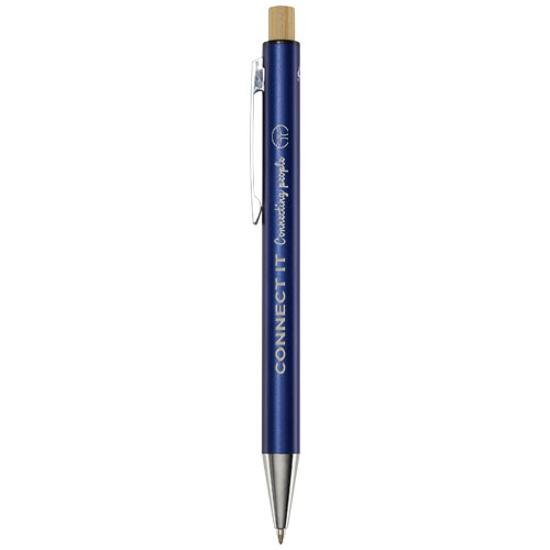 Cyrus długopis wykonany z aluminium pochodzącego z recyklingu, którego produkcja wymaga mniej energii niż w przypadku aluminium wyprodukowanego z surowców. Ogranicza również ilość odpadów na wysypiskach śmieci i pomaga chronić zasoby naturalne w celu zmniejszenia emisji gazów cieplarnianych. Przycisk jest wykonany z bambusa. Kolor tuszu: Niebieski. Żywotność: 800 metrów. Rozmiar stalówki: 1,00 mm.