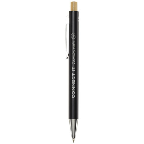 Cyrus długopis wykonany z aluminium pochodzącego z recyklingu, którego produkcja wymaga mniej energii niż w przypadku aluminium wyprodukowanego z surowców. Ogranicza również ilość odpadów na wysypiskach śmieci i pomaga chronić zasoby naturalne w celu zmniejszenia emisji gazów cieplarnianych. Przycisk jest wykonany z bambusa. Kolor tuszu: Niebieski. Żywotność: 800 metrów. Rozmiar stalówki: 1,00 mm.
