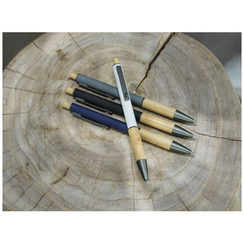 Darius długopis wykonany z aluminium pochodzącego z recyklingu, którego produkcja wymaga mniej energii niż w przypadku aluminium wyprodukowanego z surowców. Ogranicza również ilość odpadów na wysypiskach śmieci i pomaga chronić zasoby naturalne w celu zmniejszenia emisji gazów cieplarnianych. Przycisk i dolna część korpusu wykonane są z bambusa. Kolor tuszu: Czarny. Żywotność: 800 metrów. Rozmiar stalówki: 1,00 mm.