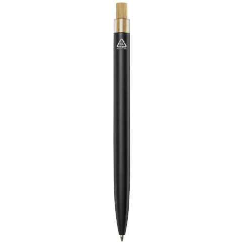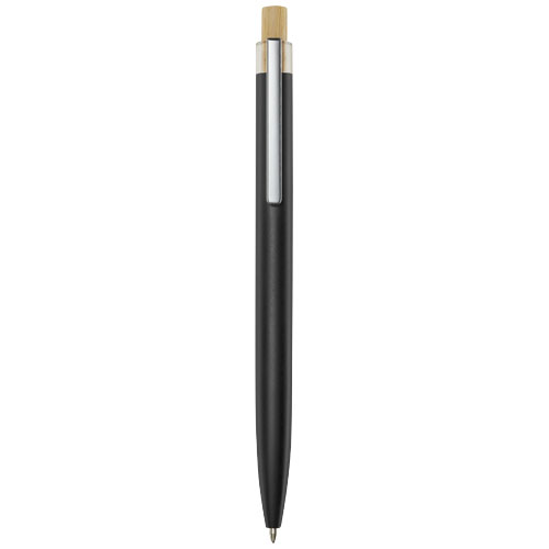 Nooshin długopis wykonany z aluminium pochodzącego z recyklingu, którego produkcja wymaga mniej energii niż w przypadku aluminium wyprodukowanego z surowców. Ogranicza również ilość odpadów na wysypiskach śmieci i pomaga chronić zasoby naturalne w celu zmniejszenia emisji gazów cieplarnianych. Przycisk jest wykonany z bambusa. Kolor tuszu: Niebieski. Żywotność: 800 metrów. Rozmiar stalówki: 1,00 mm.