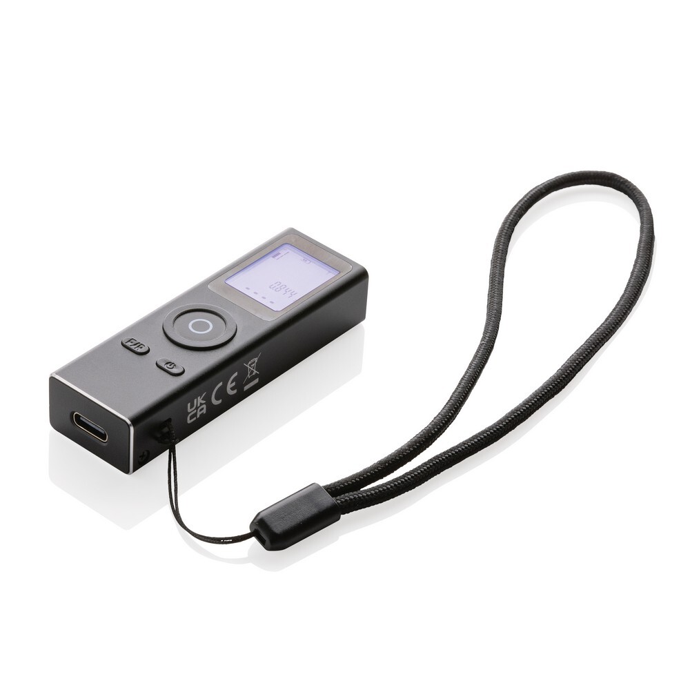 Dalmierz laserowy, zasięg pomiaru do 30 m, wykonany z aluminium z recyklingu, całkowita zawartość materiałów z recyklingu obliczona na podstawie wagi całkowitej przedmiotu: 22%, wbudowana bateria o pojemności 250 mAh, ładowanie przez USB, laser klasy 2, mierzy odległość, powierzchnię, objętość oraz przekątne, wejście USB typu C