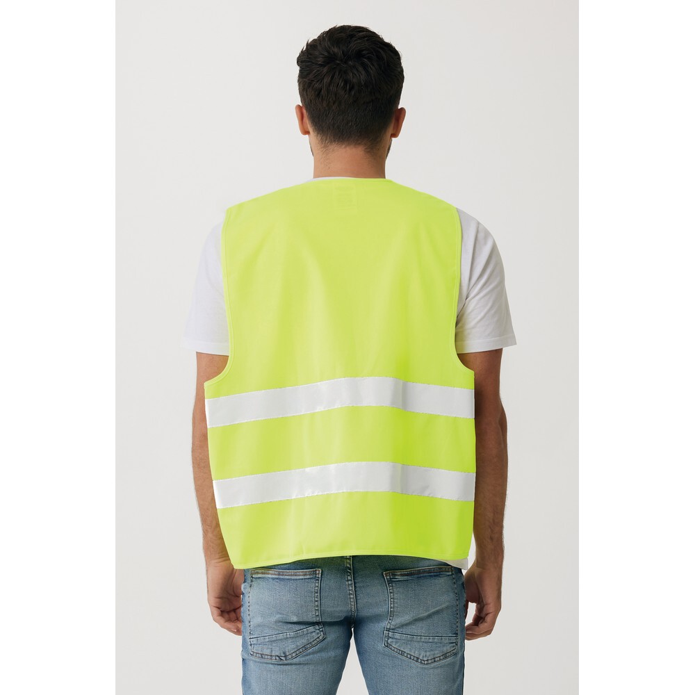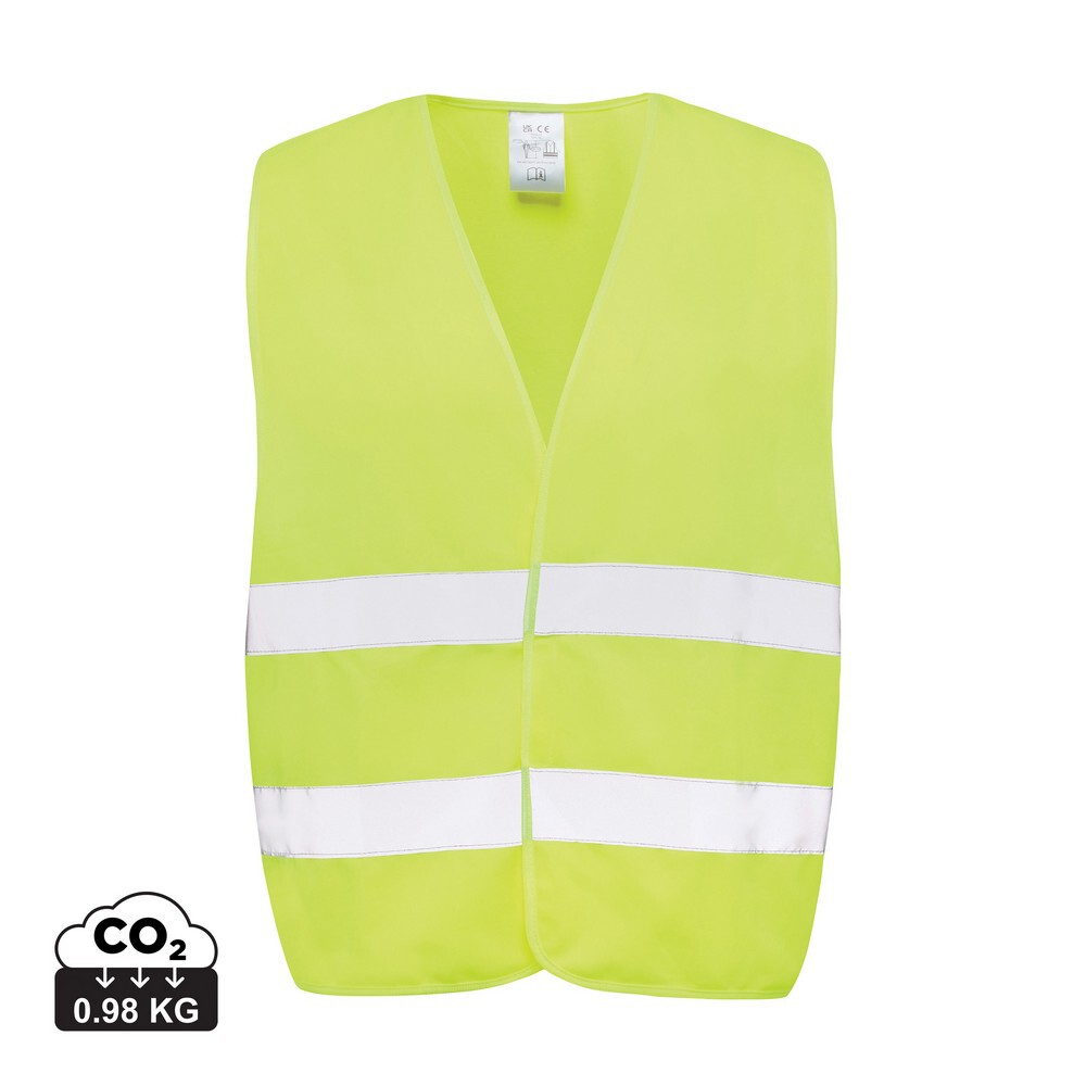 Kamizelka odblaskowa, wykonana z PET z recyklingu, całkowita zawartość materiałów obliczona na podstawie wagi całkowitej przedmiotu: 76%, zgodna z normami EN ISO 20471:2013+A1:2016, UE 2016/425/UE