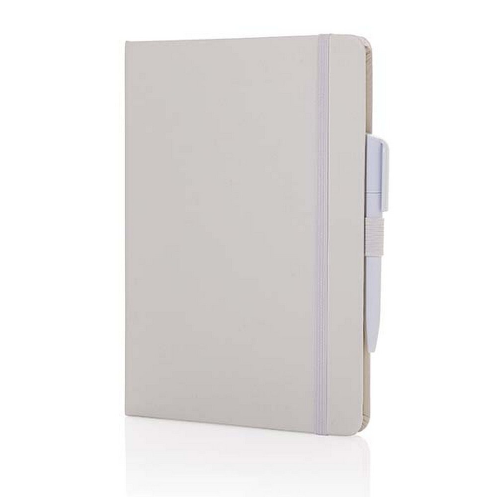 Notatnik A5 (80 kartek w linie z papieru makulaturowego o gramaturze 70 g/m2), okładka wykonana ze skóry z recyklingu, pętla na długopis, elastyczna opaska do zamykania, całkowita zawartość materiałów z recyklingu obliczona na podstawie wagi produktu: 67%