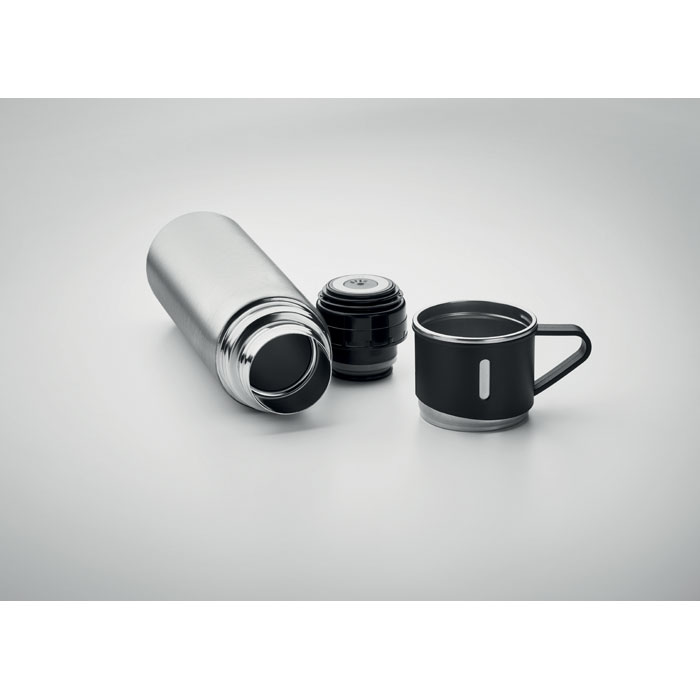 Dwuścienny termos ze stali nierdzewnej ze szczelną zakrętką i kubkiem. Pojemność: termos 420 ml, kubek 150 ml.