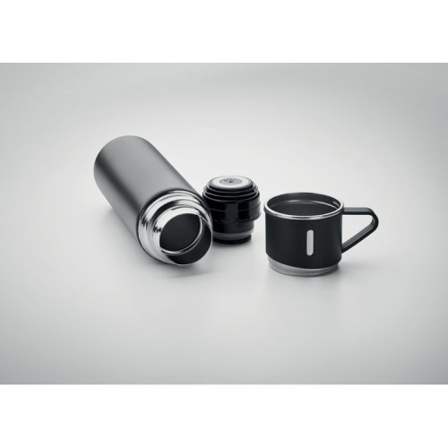 Dwuścienny termos ze stali nierdzewnej ze szczelną zakrętką i kubkiem. Pojemność: termos 420 ml, kubek 150 ml.