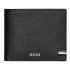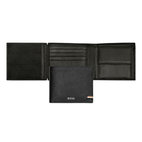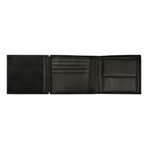 Ten potrójny portfel z kieszenią na monety jest wykonany ze starannie dobranej, czarnej, teksturowanej skóry. Jest ozdobiony luksusową chromowaną tabliczką z podpisem BOSS i posiada wewnętrzną podszewkę z monogramem. Inną charakterystyczną cechą tej kultowej wersji jest trójkolorowa flaga tekstylna, która zdobi wszystkie przedmioty z tej serii Portfel zawiera: 2 przegrody na waluty 8 miejsc na karty 3 przegródki boczne 1 miejsce na monety Zgodnie z DNA marki BOSS, jest prosty, funkcjonalny, elegancki i minimalistyczny.