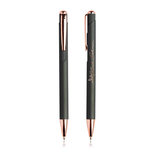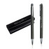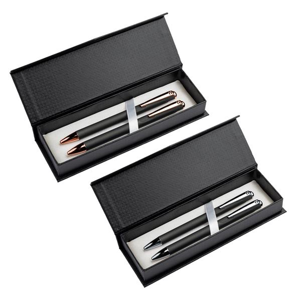Nowoczesny zestaw piśmienniczy, składający się z długopisu oraz ołówka. Całość zapakowana w stylowe etui prezentowe z magnetycznym zamknięciem. Nasz zestaw to ponadczasowe połączenie designu z metalowymi detalami - całość sprawia, że nasz zestaw prezentuje się niezwykle elegancko. Dodatkowym atutem jest piękny, błyszczący grawer, który współgra z metalowymi elementami. Długopis posiada wkład piszący na niebiesko, a wraz z ołówkiem działają w systemie push.