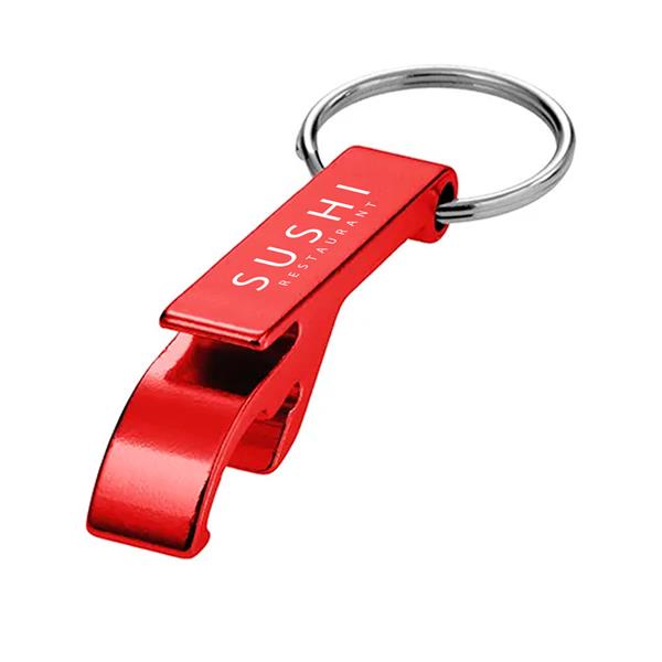 Aluminiowy breloczek w kształcie otwieracza do butelek.