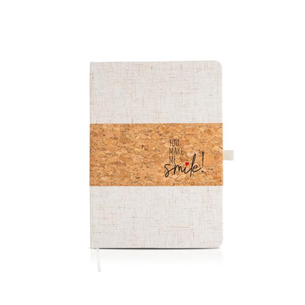 Piękny notes A5, którego okładka pokryta jest lnem oraz korkiem. 128 gładkich stron.