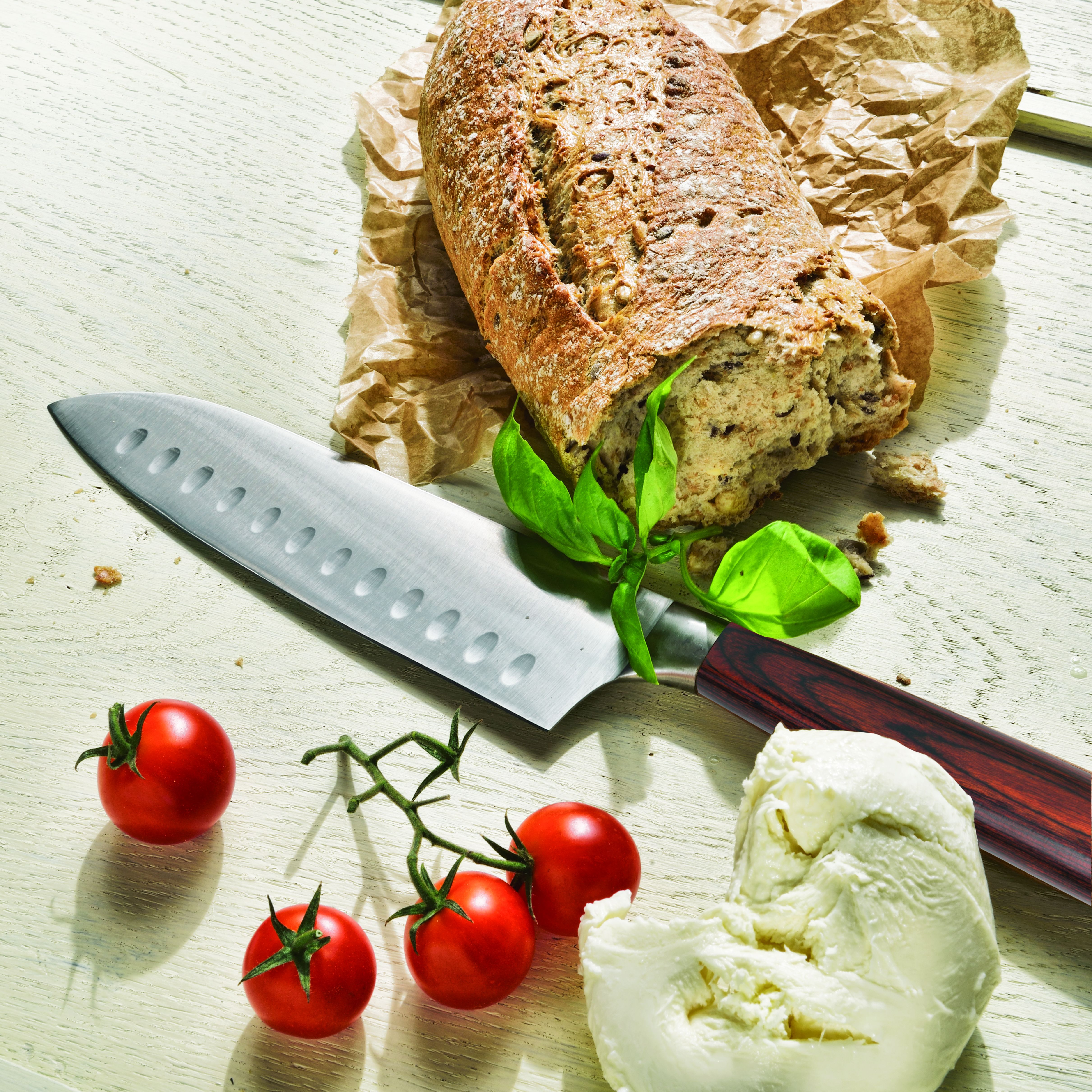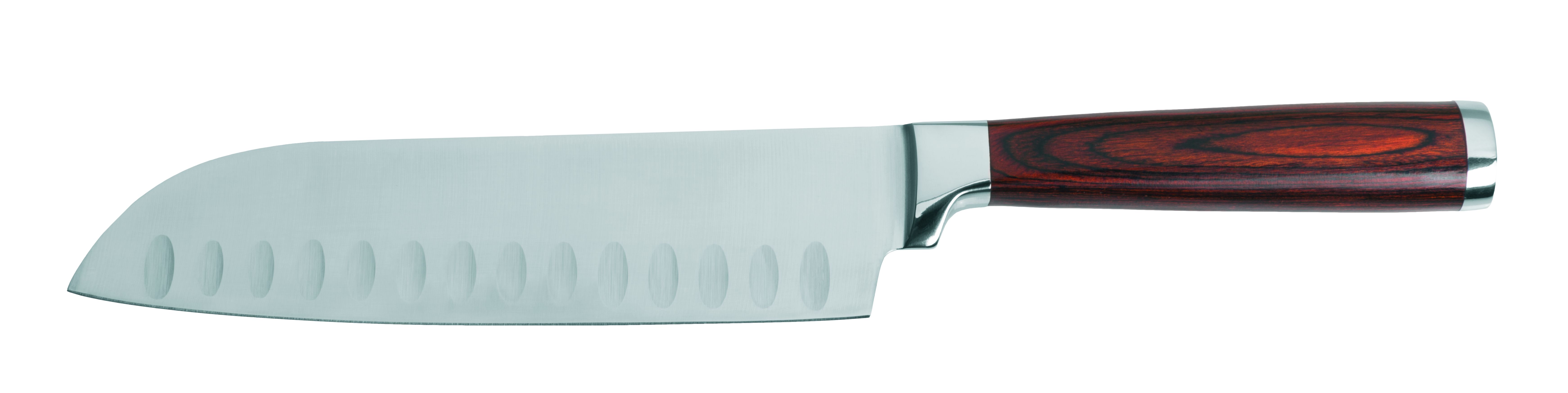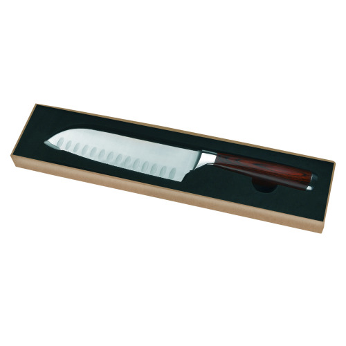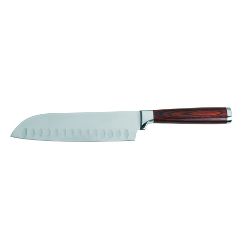 Ekskluzywny nóż kuchenny Santoku wykonany z niemieckiej stali. Nazwa `Santoku` oznacza `trzy zalety` lub `trzy zastosowania` i odnosi się do trzech głównych zadań, które ten nóż doskonale wykonuje - krojenia, siekania i rozdrabniania. Cienkie, bardzo ostre i gładkie ostrze zapobiega utracie soków podczas krojenia mięsa i owoców. Zapakowany w prezentowe pudełko Vanilla Season.