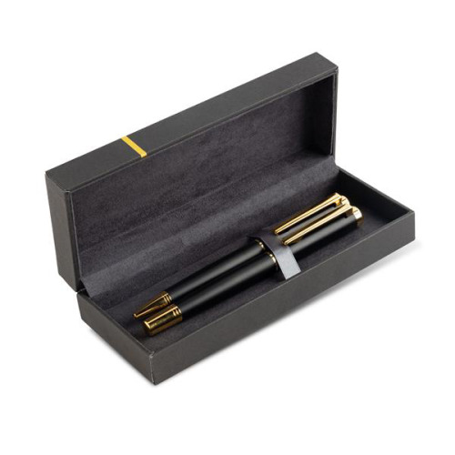 Zestaw pióro oraz długopis w eleganckim pudełku. Ciekawy design tekstury pióra, pudełeczko wyłożone miękka poduszeczką oraz blaszana płytka na zewnątrz nadają świetny wygląd zestawu.