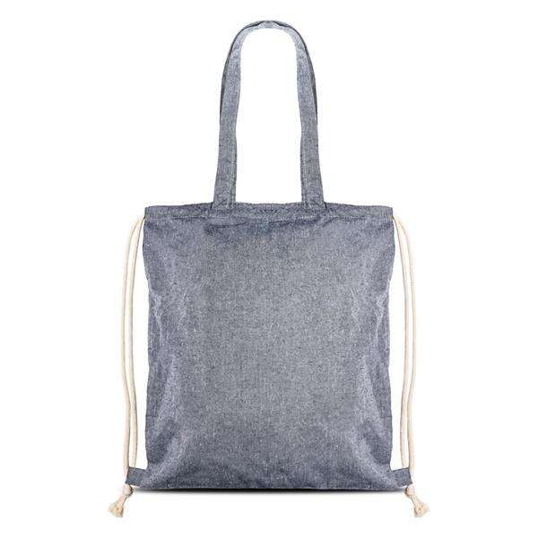Backpack bag, long handles in recycled cotton 140g/m². A versatile gift that can be used in different ways, as it includes drawstring straps to use as a backpack and long handles to use as a bag. Made from recycled and eco-friendly material.