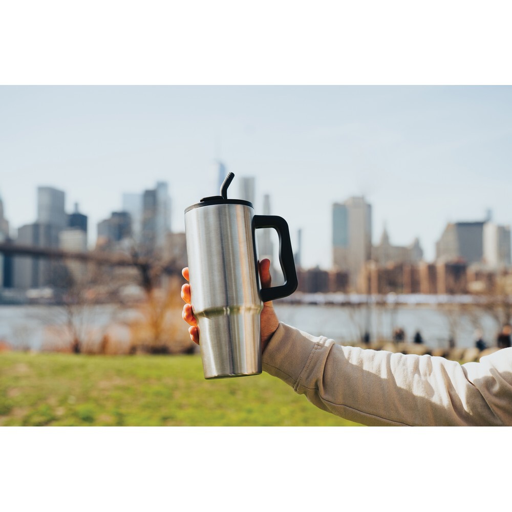 Kubek termiczny 900 ml, wykonany ze stali nierdzewnej z recyklingu, podwójne ścianki ze stali nierdzewnej z próżnią pomiędzy, zakręcane wieczko z dziubkiem i słomką, zalecane mycie ręczne
