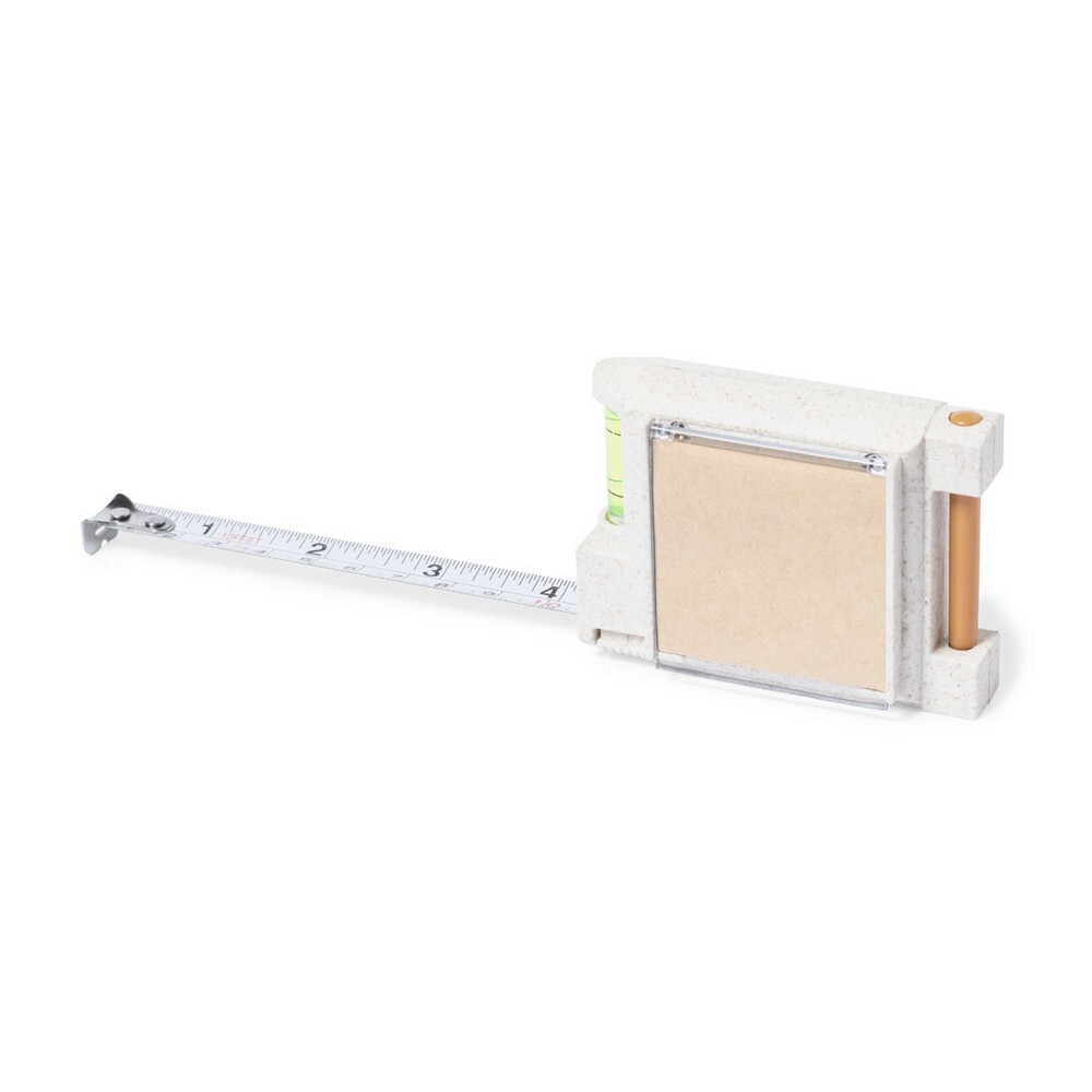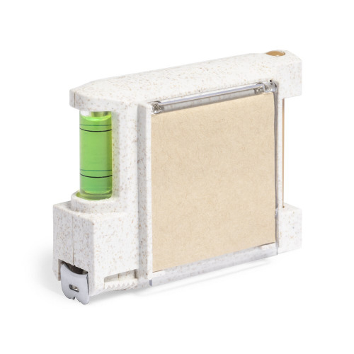 Miara 3 m z blokadą i metalowym klipem, skala metryczna i calowa, poziomica, notatnik 4,5 x 4,5 cm (12 kartek), długopis, obudowa wykonana z włókien słomy pszenicznej