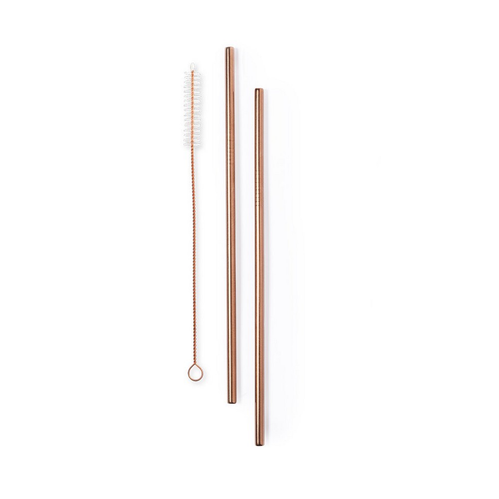 Zestaw 2 słomek wielokrotnego użytku ze stali nierdzewnej, miedziane wykończenie, czyścik i welurowy woreczek w komplecie