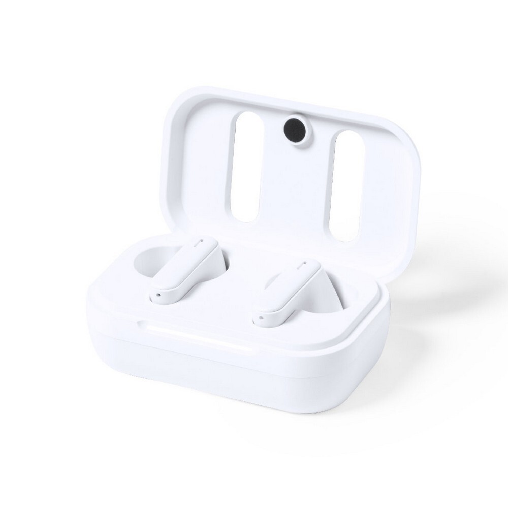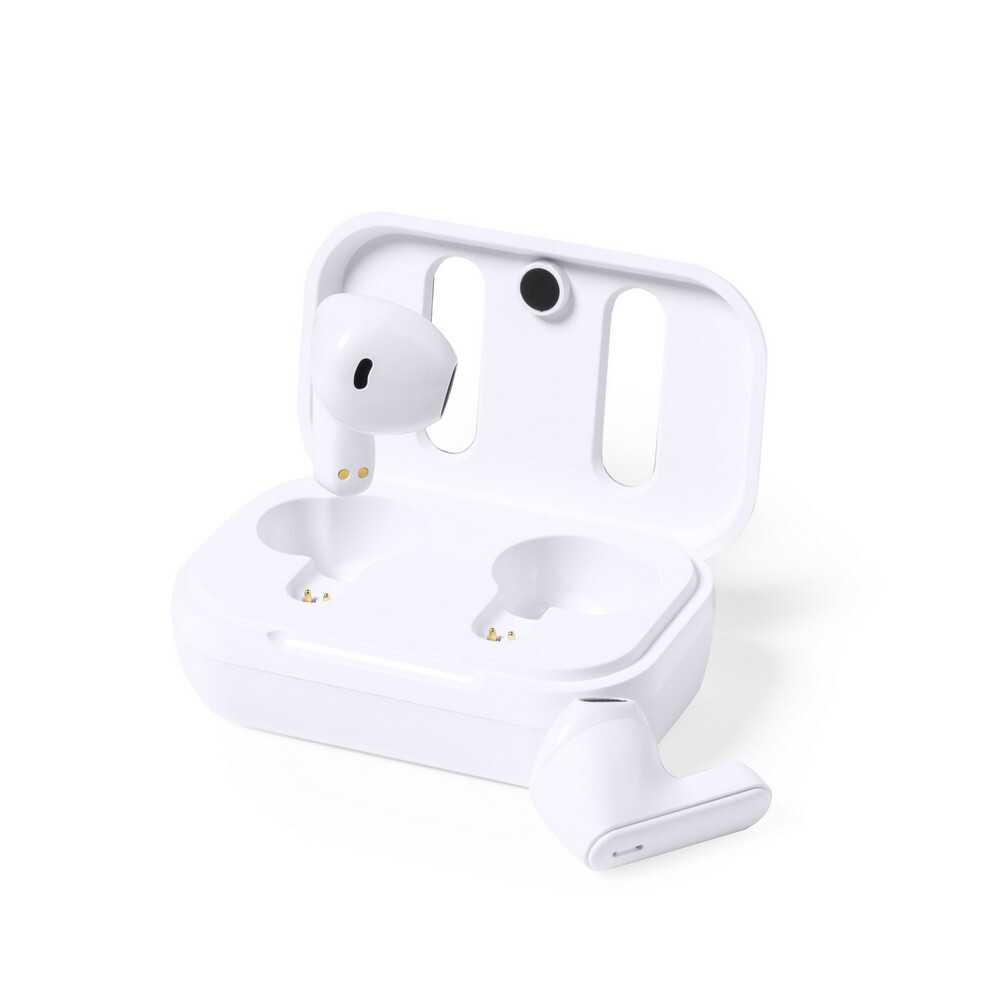 Słuchawki bezprzewodowe BT 5.1 wykonane z RABS, w etui ładującym z elementem ze skóry z recyklingu, douszne, bateria stacji ładującej 300 mAh, bateria słuchawek 30 mAh, zintegrowane przyciski dotykowe na każdej słuchawce, funkcja odbierania połączeń, czas pracy: ok. 4-5h, zasięg do 10 m, ładowane przez USB, wejście USB typu C, kabel USB typu C w komplecie