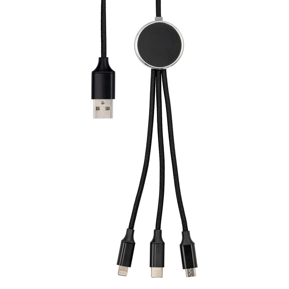 Kabel do ładowania Exclusive Collection z 4 końcówkami: USB, micro USB, USB typu C oraz końcówką kompatybilną z urządzeniami iOS, 5V/2.4A, długość 120 cm, grawer ukazuje podświetlaną powierzchnię