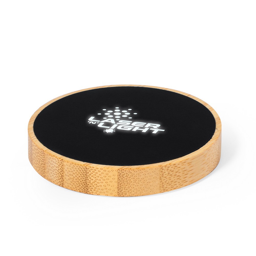 Bambusowa ładowarka bezprzewodowa 15W, grawer ukazuje podświetlaną powierzchnię, działa z telefonami posiadającymi możliwość ładowania indukcyjnego, wejście USB typu C 5-9V/1.5-2A, antypoślizgowy spód, kabel USB typu C w komplecie