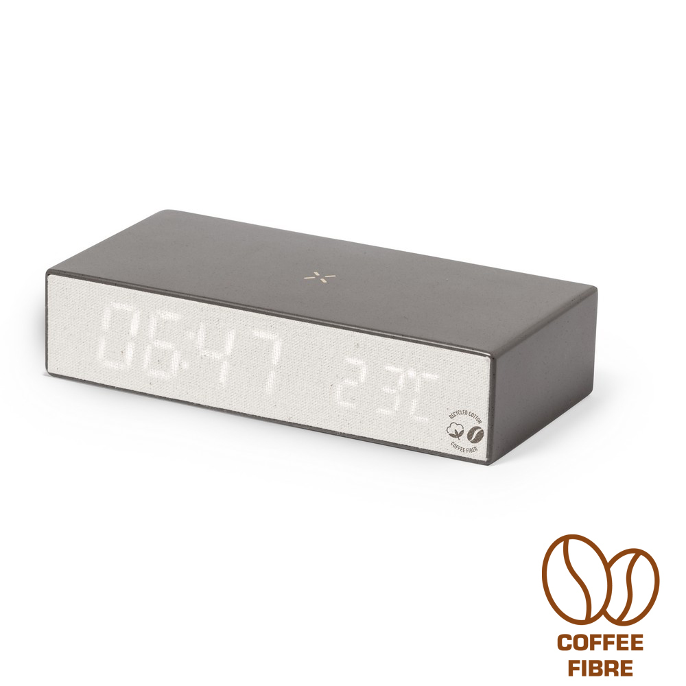 Ładowarka bezprzewodowa 10W, wbudowany zegar cyfrowy, funkcje: alarm, temperatura, zegar i data, obudowa wykonana z łusek kawowych i bawełny z recyklingu, działa z telefonami posiadającymi możliwość ładowania indukcyjnego, zgodny z certyfikatem GRS (Global Recycled Standard)