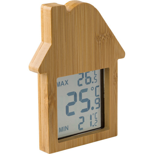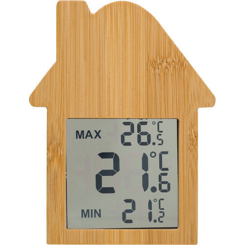 Stacja pogodowa "domek", wykonana z bambusa, przyssawka z tyłu, funkcje: aktualna temperatura, minimalna temperatura, maksymalna temperatura