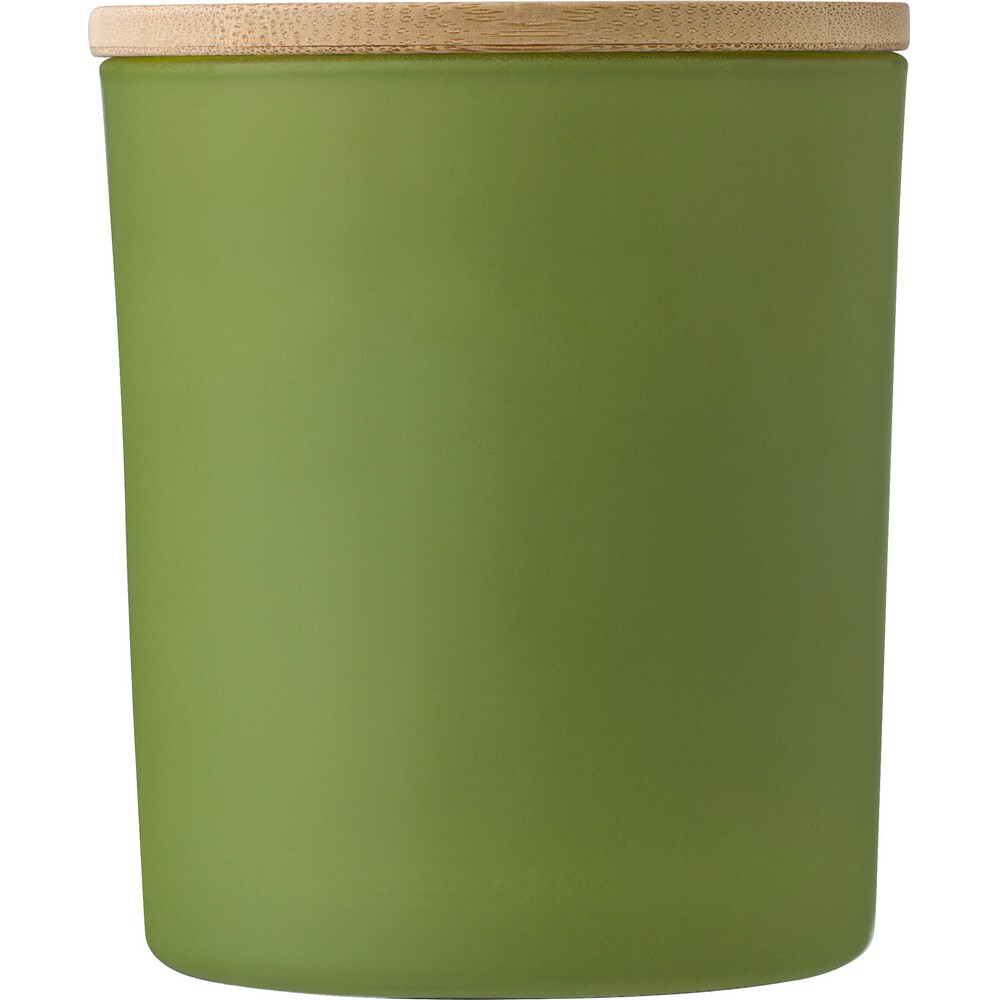 Świeczka zapachowa w szklanym słoiczku z bambusowym wieczkiem, zawiera głównie wosk roślinny (wosk carbauba), czas palenia około 20h