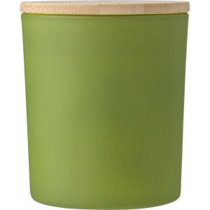 Świeczka zapachowa w szklanym słoiczku (02-wanilia, 05-cynamon, 03-olejek sandałowy, 06-jaśmin) z bambusowym wieczkiem, zawiera głównie wosk roślinny (wosk carbauba), czas palenia około 20h
