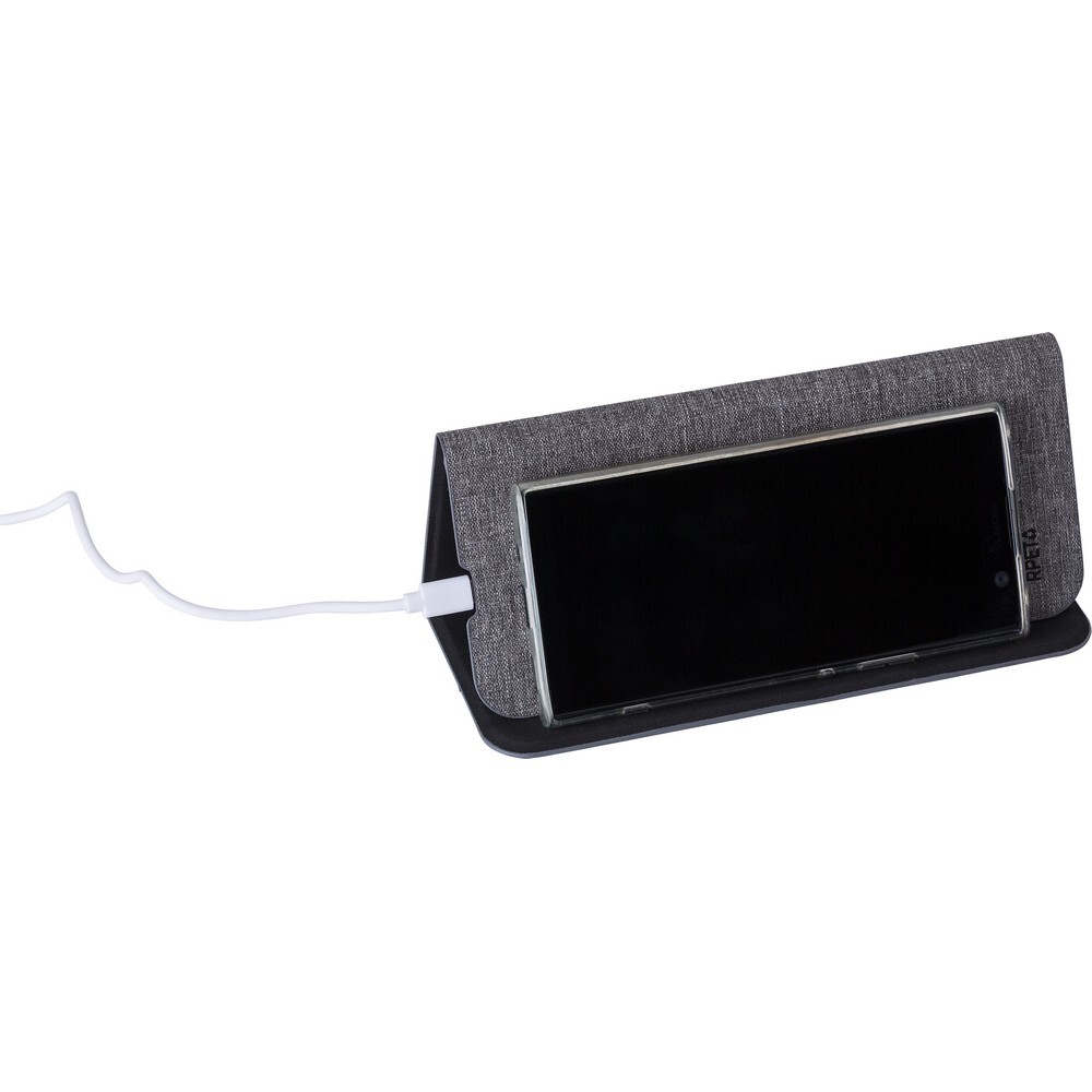 Podkładka pod mysz wykonana z poliestru RPET, ładowarka bezprzewodowa 10W, działa z telefonami posiadającymi możliwość ładowania indukcyjnego, stojak na telefon