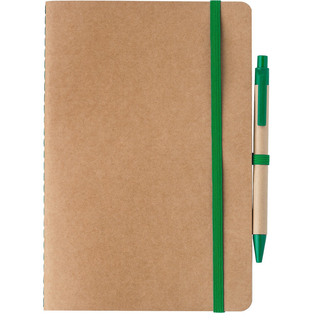 Notatnik A5 z tektury pochodzącej z recyklingu (60 pustych kartek), elastyczna opaska do zamykania, dołączony długopis ze słomy pszenicznej