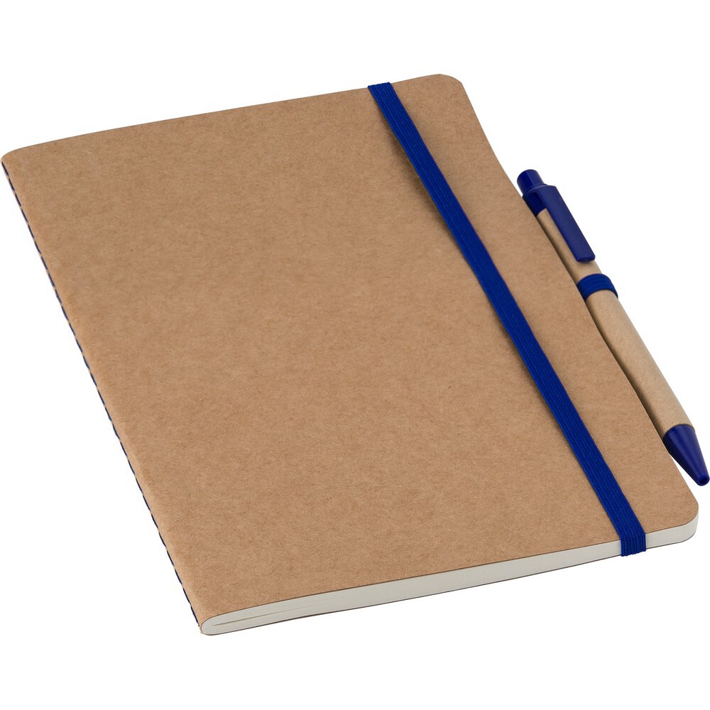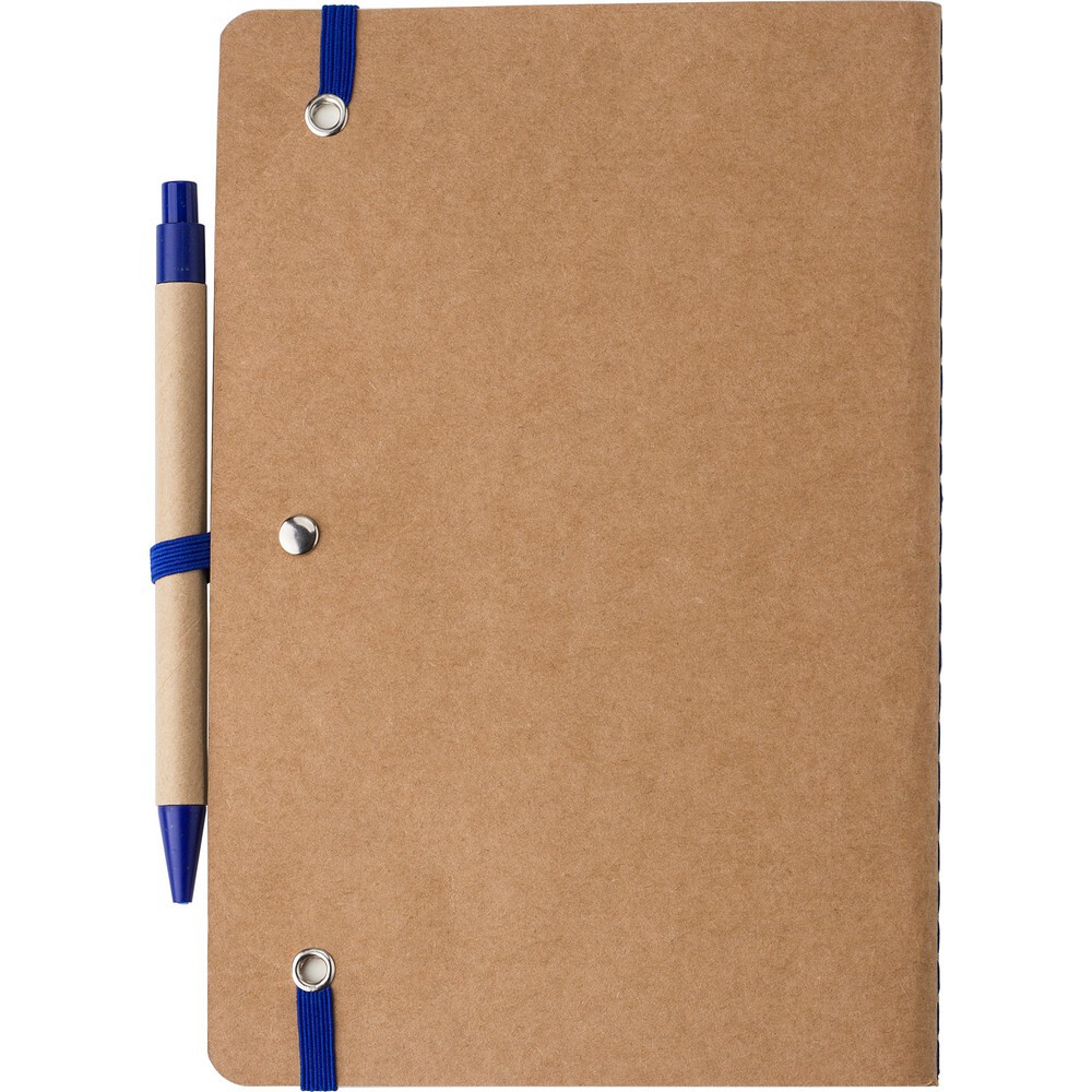 Notatnik A5 z tektury pochodzącej z recyklingu (60 pustych kartek), elastyczna opaska do zamykania, dołączony długopis ze słomy pszenicznej