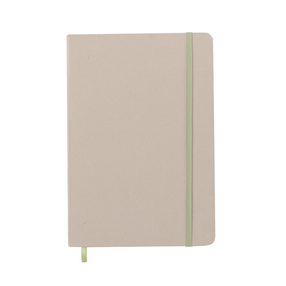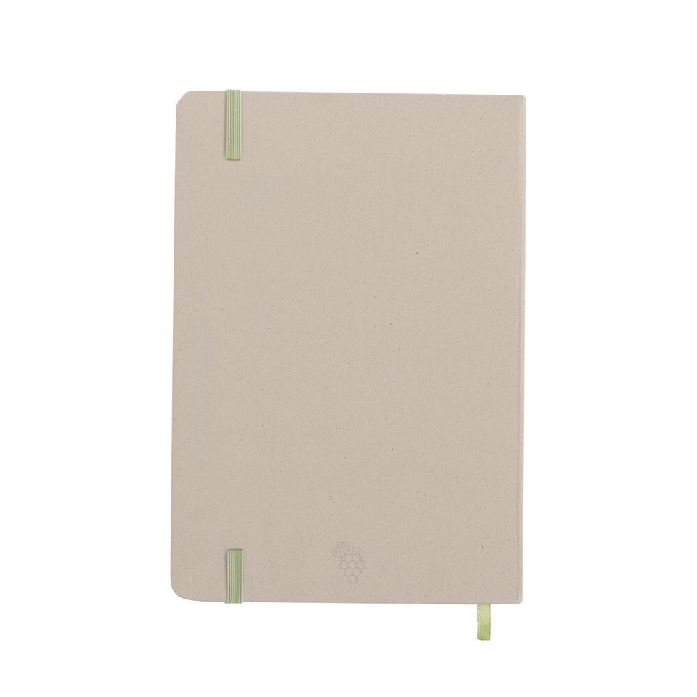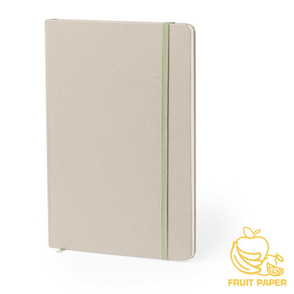 Notatnik (ok. A5, 80 kartek w linie), wykonany z kartonu z recyklingu i papieru z owoców, twarda okładka, tasiemka zakładkowa i elastyczna opaska do zamykania