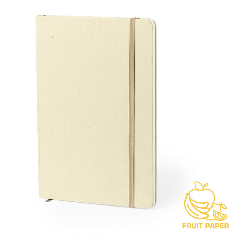 Notatnik (ok. A5, 80 kartek w linie), wykonany z kartonu z recyklingu i papieru z owoców, twarda okładka, tasiemka zakładkowa i elastyczna opaska do zamykania