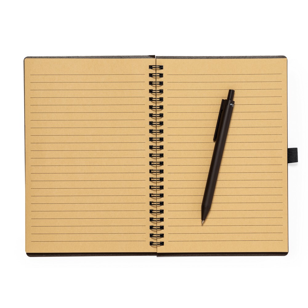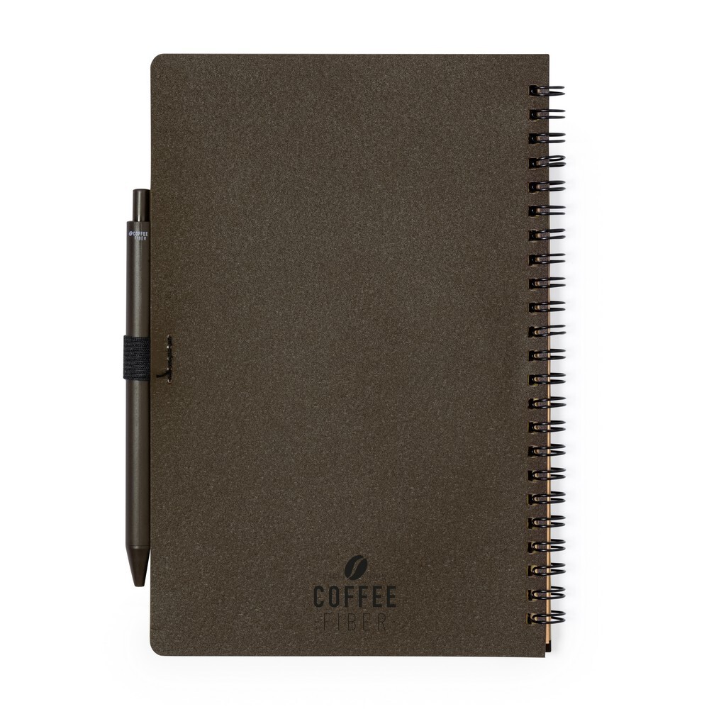 Notatnik A5 (80 kartek w linie), miękka okładka wykonana z łusek kawowych, spiralne bindowanie, długopis z trzonem z łusek kawowych w komplecie