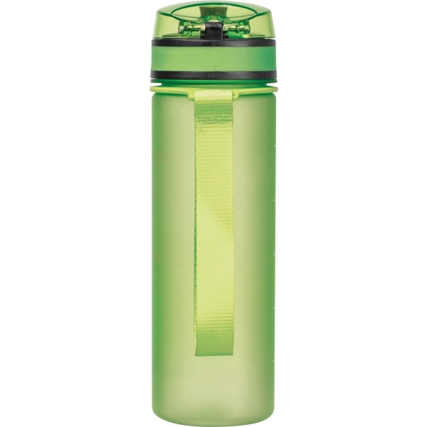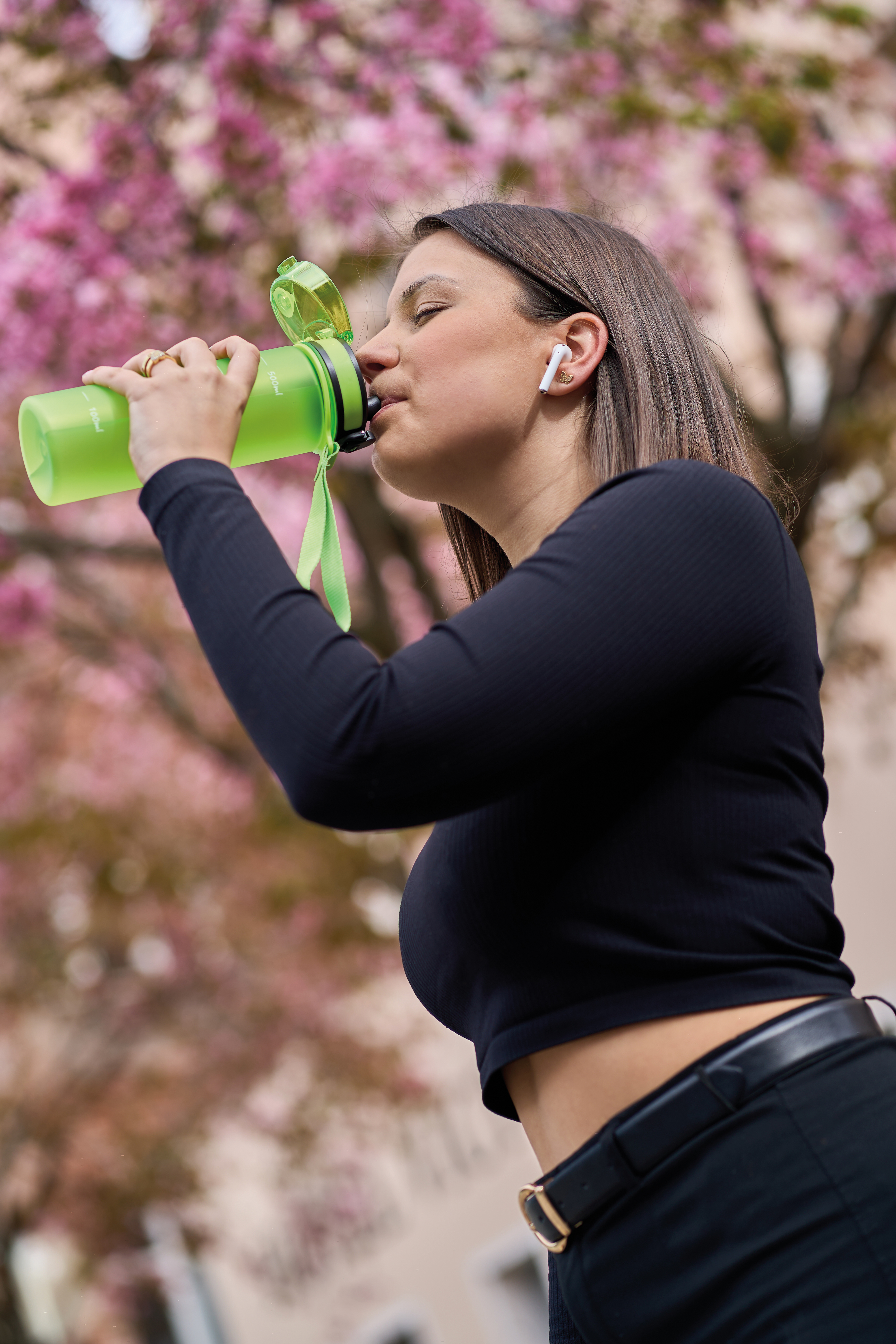 Butelka to sportowy i funkcjonalny gadżet, idealny do codziennego użytku oraz aktywności fizycznych. Wykonana z trwałego materiału (tritan), cechuje się przyjemną w dotyku powierzchnią soft touch, która zapewnia komfortowy chwyt, nawet podczas intensywnego użytkowania. Butelka wyposażona jest w wygodne otwieranie na przycisk, co umożliwia szybkie i łatwe picie bez konieczności odkręcania nakrętki. Dodatkowo posiada praktyczną pętlę do noszenia, co ułatwia jej przenoszenie i mocowanie na ekwipunku sportowym czy plecaku. Na powierzchni butelki znajduje się nadrukowana miarka w ml, dzięki czemu łatwo kontrolować ilość wypijanego napoju. Pojemność butelki wynosi 570 ml, co sprawia, że nie ciąży w plecaku, a zapewnia odpowiednią ilość płynów. Butelka wyposażona jest również w podwójne zabezpieczenie przed wylaniem (unbolt&press), które zapobiega przypadkowemu otwarciu butelki, nawet gdy znajduje się w torbie czy plecaku